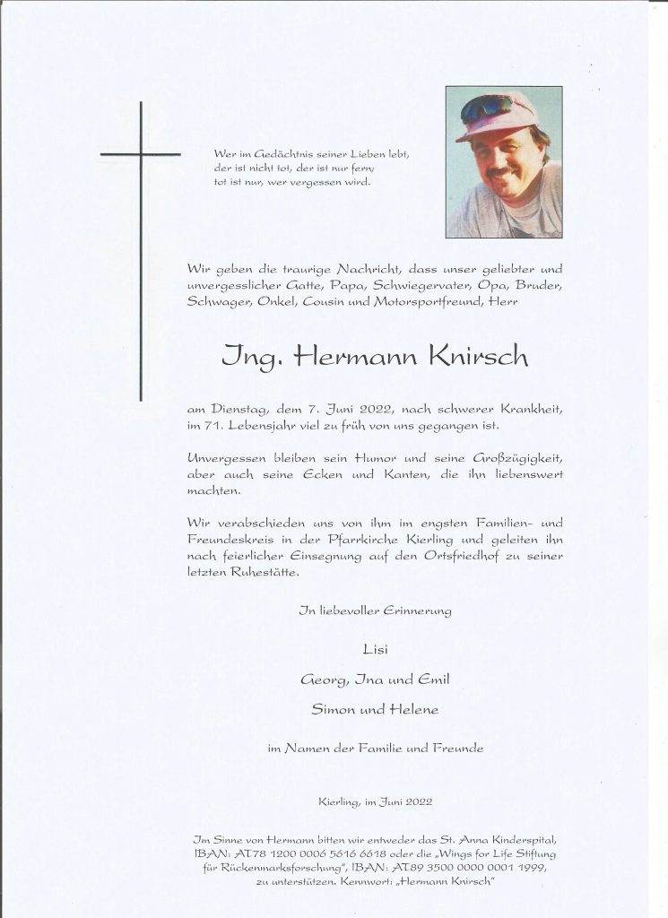 Nachruf Hermann Knirsch 31. 01. 1952 bis 07. 06. 2022 Ein Leben für den Motorradsport Nach seiner HTL Ausbildung in KFZ Technik startete er seine berufliche Karriere bei ÖAF Gräf & Stift in Wien. Danach machte er sich selbständig und eröffnete seine Motorrad Werkstätte. 2015 hat er sich in den „Unruhe“-Stand verabschiedet. Er genoss es…