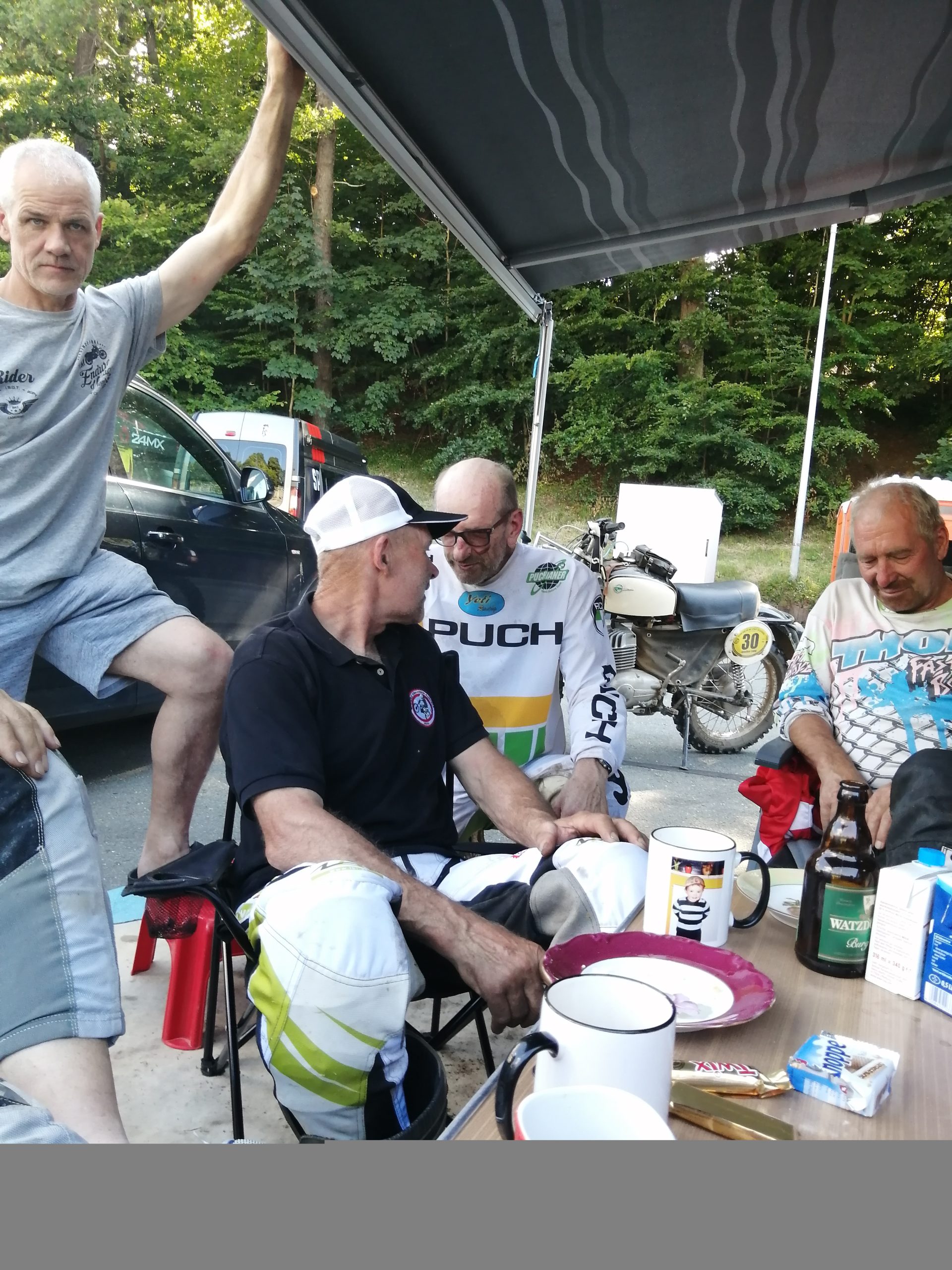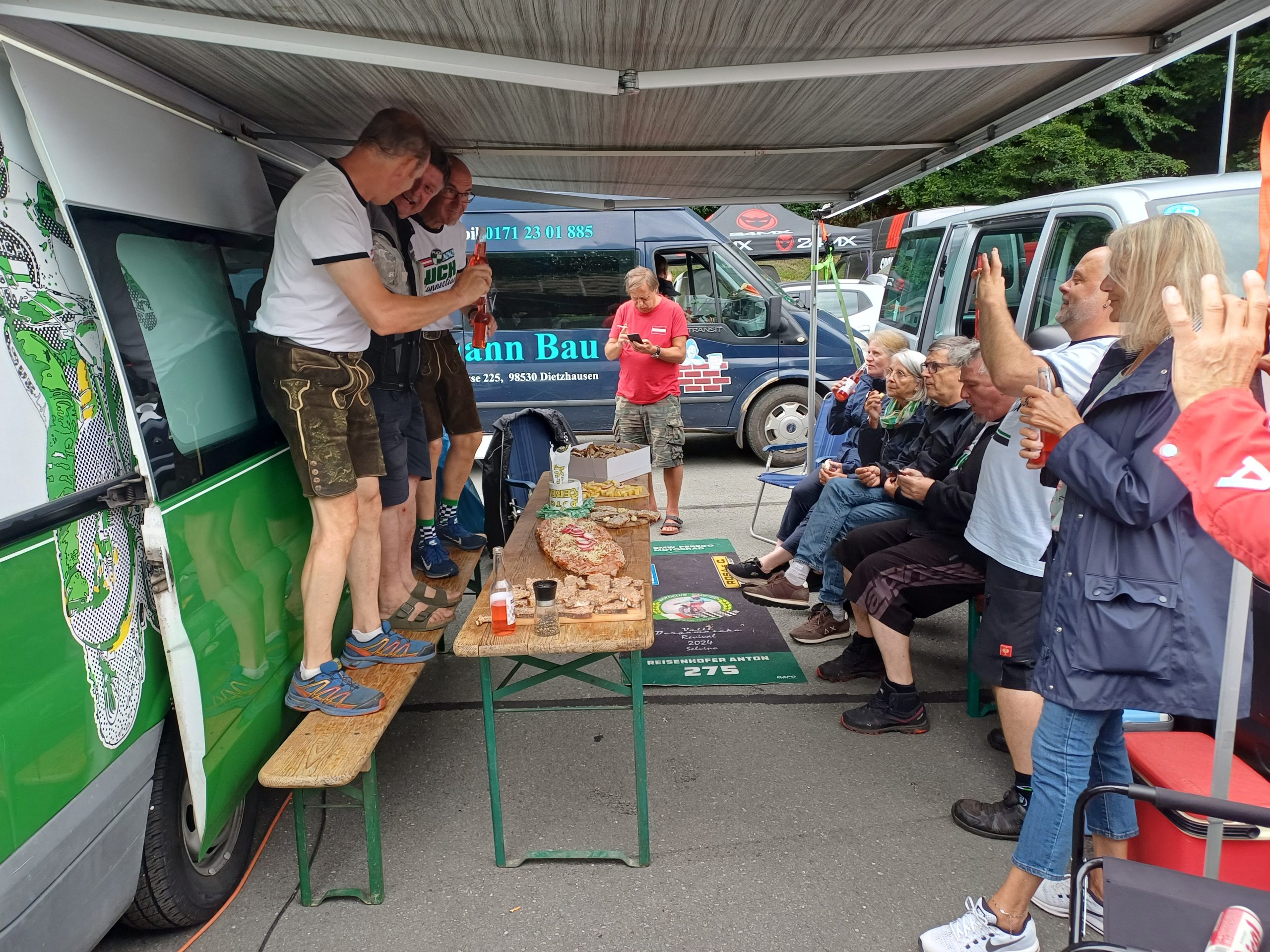 Am Freitagabend lud Anton Reisenhofer und seine Puchianer, uns zu einer Steirerjause mit Booster aus Toni´s eigenen Weingarten ein. Aber auch das Kaiserwetter an diesem Zschopau Wochenende trug viel zur guten Stimmung im Fahrerlager bei.